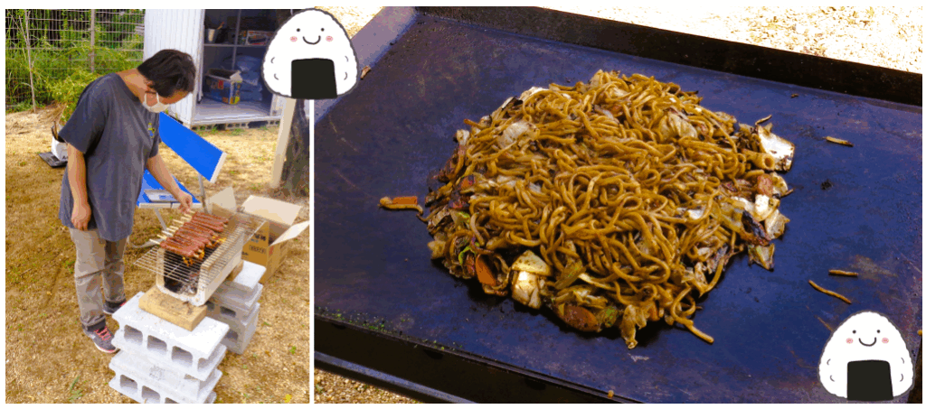 暑さも和らいだ天候の下、炭で焼いたばかりのバーベキュー串やフランクフルト、焼きそば、新米のおにぎりを皆んなで美味しく頬張りました。