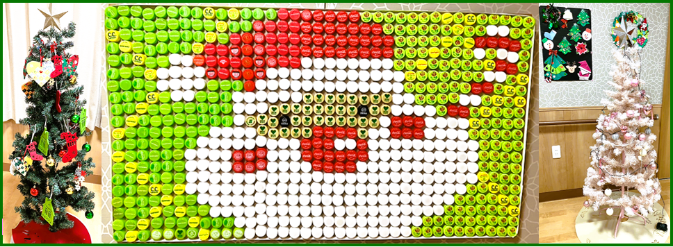 12月24日㈬、リビングには二つの趣の違うクリスマスツリー🎄とペットボトルのキャップで作られたサンタさんが飾られた🎅楽しい雰囲気の中でクリスマス会をしました🌟