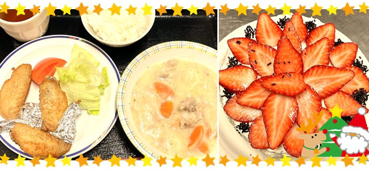 クリスマスメニューの夕食で🍗食後は手作りの🍓ケーキ🍰を美味しくいただきました😋✨
